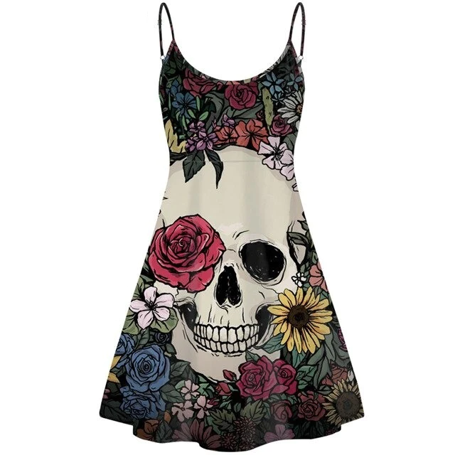 Mettez votre belle silhouette en valeur avec cette jolie robe tête de mort à motif symbolique ! Avec son détail crâne humain associé aux fleurs multicolores, cette robe courte à bretelles fines réglables raconte la victoire de la vie face au pouvoir du mal. Cette robe tête de mort à coupe évasée a été conçue en coton et polyester pour amplifier le confort de son porteur, sans la limiter dans ses mouvements. Profitez également de son col rond et de finition haut de gamme pour rester jeune et tendance. Cette robe tête de mort femme est facile à porter et s’accorde à toutes vos tenues.